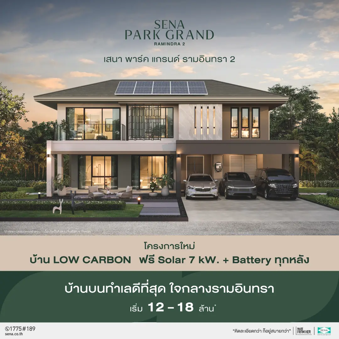 เสนา พาร์ค แกรนด์ รามอินทรา 2 บ้านพรีเมียมคอนเซปต์ Live Green, Stay Grand กับนวัตกรรมอนาคตที่สุดแห่งการประหยัดไฟสูงสุดถึง 85%* ให้คุณใช้ไฟฟรี 24 ชม.* พร้อมติดตั้ง Solar ขนาด 7 kW. และ Battery ให้บ้านทุกหลัง!