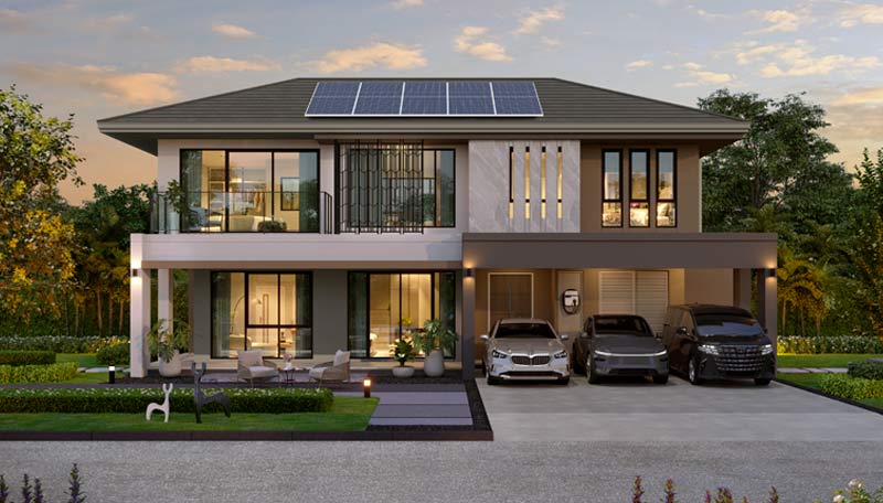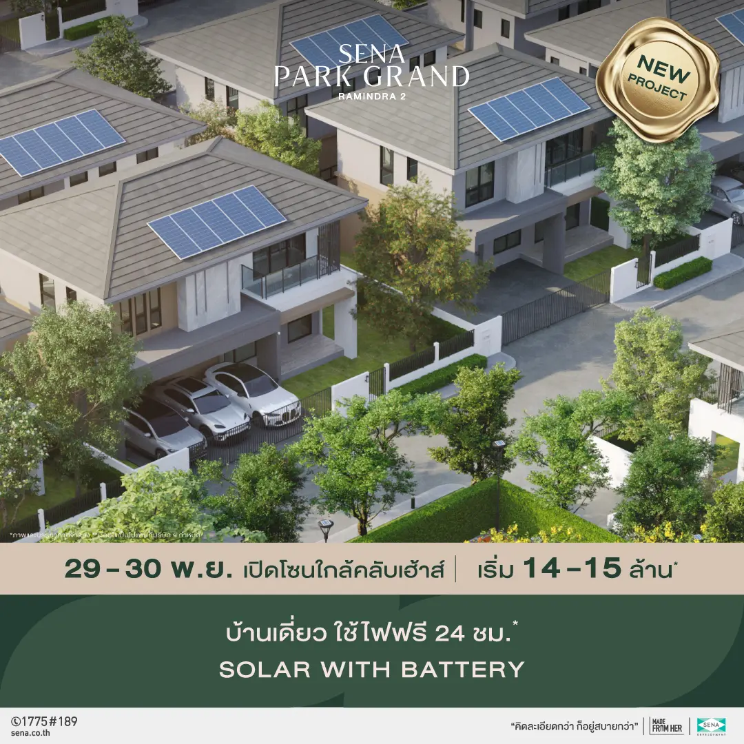เสนา พาร์ค แกรนด์ รามอินทรา 2 บ้านพรีเมียมคอนเซปต์ Live Green, Stay Grand กับนวัตกรรมอนาคตที่สุดแห่งการประหยัดไฟสูงสุดถึง 85%* ให้คุณใช้ไฟฟรี 24 ชม.* พร้อมติดตั้ง Solar ขนาด 7 kW. และ Battery ให้บ้านทุกหลัง!